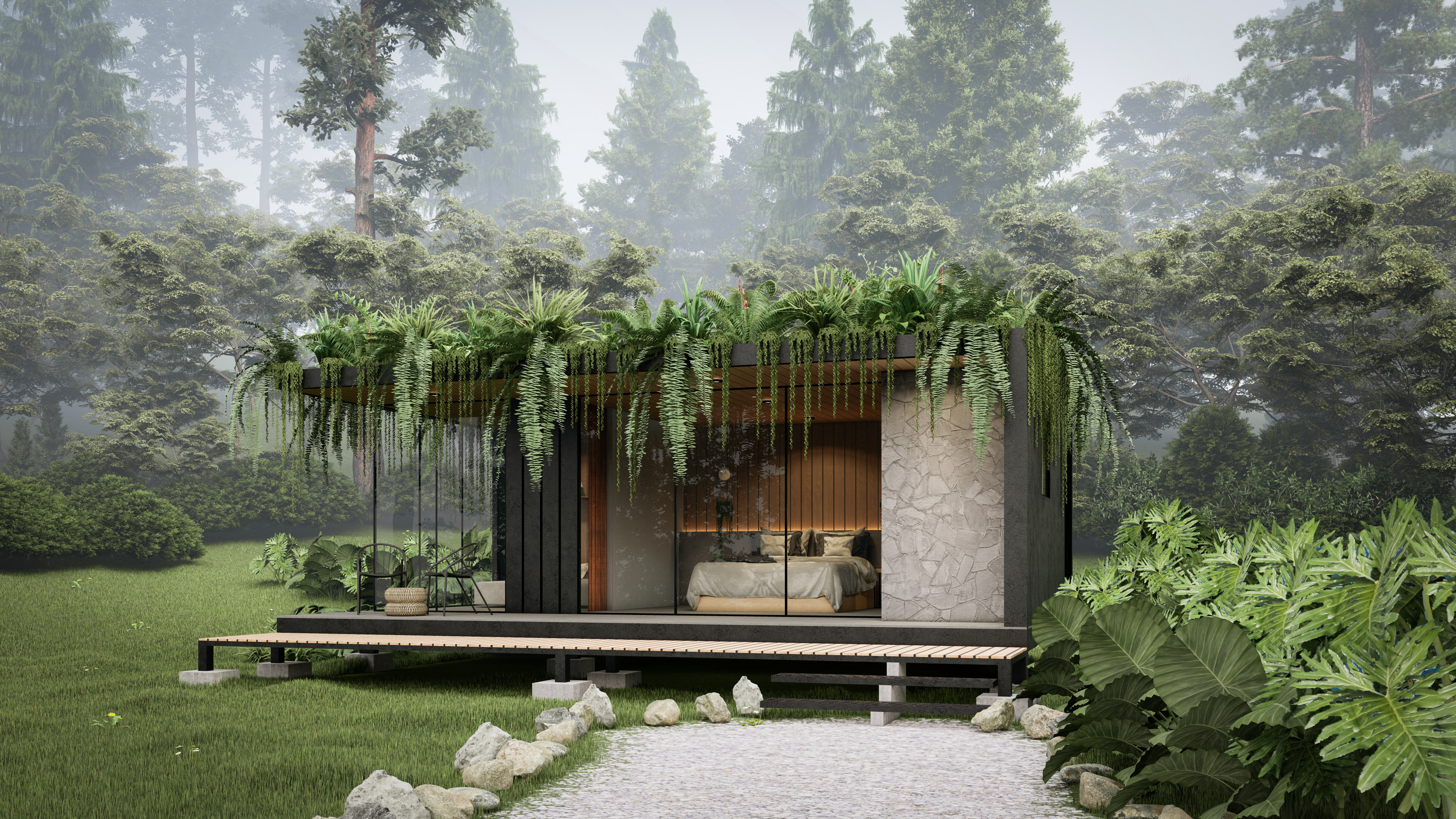 Evocando los paisajes de las montañas cafeteras se encuentra el prototipo Calarcá como un cubo que se adapta a topografías inclinadas, combinando el cristal como elemento principal para abrir la visual y disfrutar de la naturaleza.